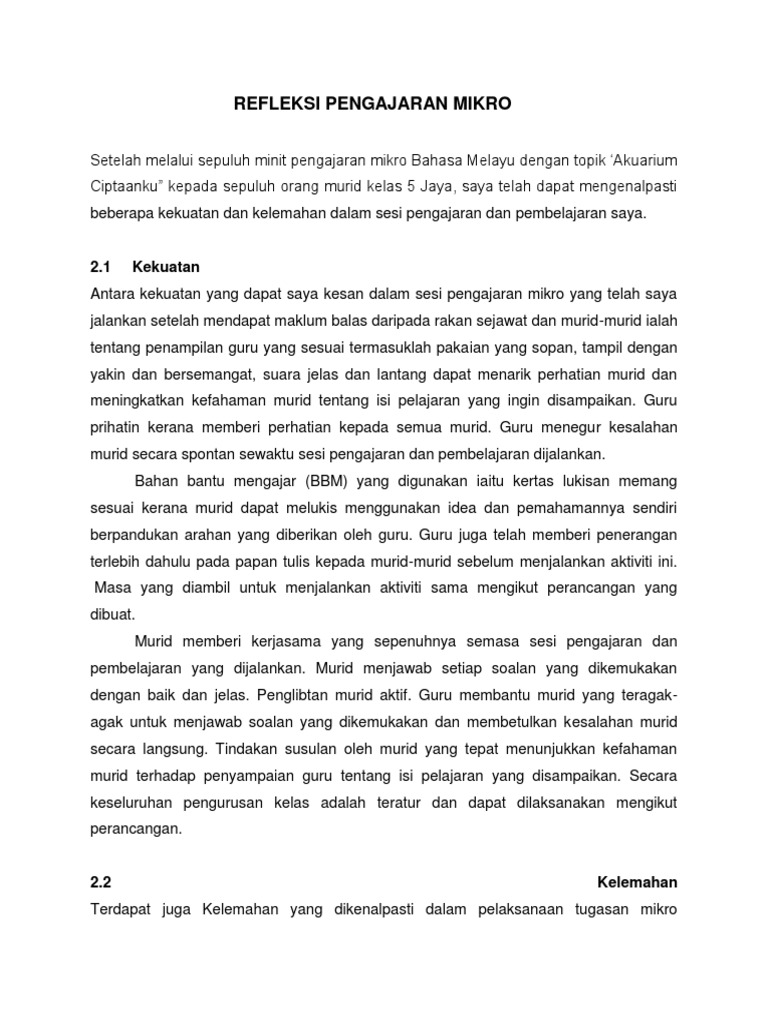 Doc Refleksi Makro Pengajaran Rozihan Ibrahim Academia Edu from 0.academia-photos.com Pengajaran dan pembelajaran di sekolah memerlukan persediaan dan penyediaan rancangan pengajaran harian (rph) oleh guru. Refleksi mikro teachingkekuatansemasa menjalankan mikro teaching saya telah dapat mengesan beberapa kekuatanpengajaran saya. Sebagai contoh dalam aktiviti pengajaran dan pembelajaran kita boleh menggunakan sumber teknologi sebagai salah satu bahan bantu belajar. Oleh itu, kelebihan atau kekuatan yang dapat dikesan dalam menjalankan p & p iaitu ketegasan dan kelantangan suara. Bmm3105 pengajaran dan pembelajaran bahasa melayu berbantukan komputer. Dengan adanya bahan bantu belajar ini ia dapat memberi kesan positif kepada proses pembelajaran murid. Kajian tindakan:refleksi pengajaran dan pembelajaran lalu. Pada zaman dahulu pembelajaran hanya berpusatkan guru manakala pada abad ini pembelajaran adalah berpusatkan.